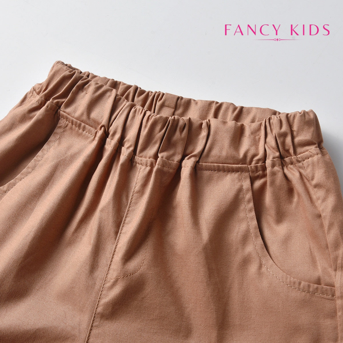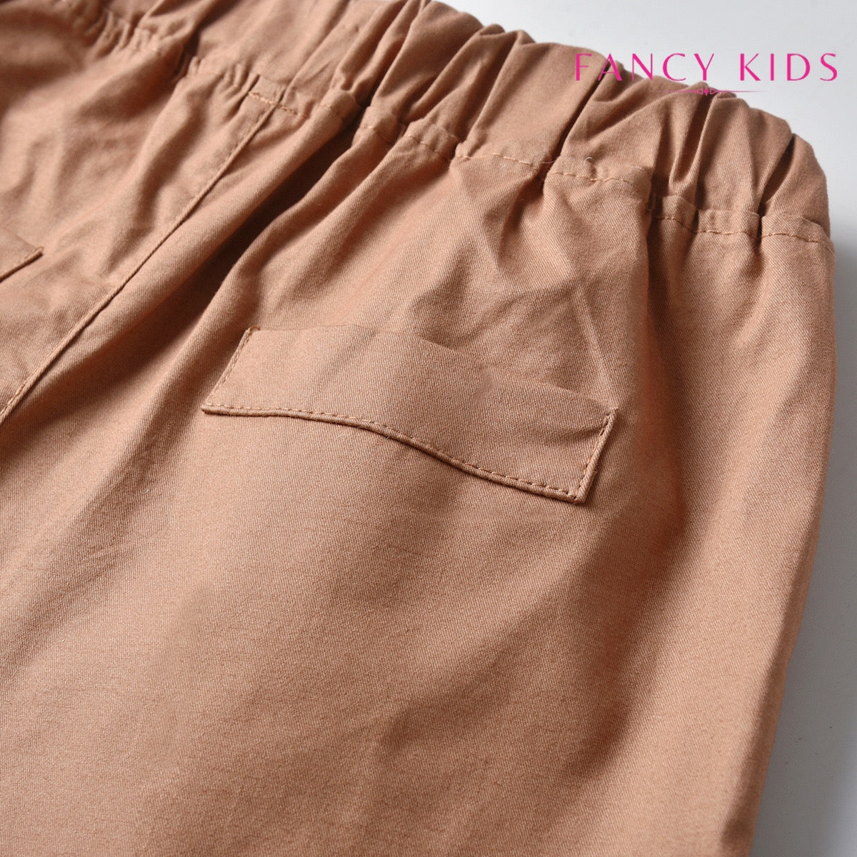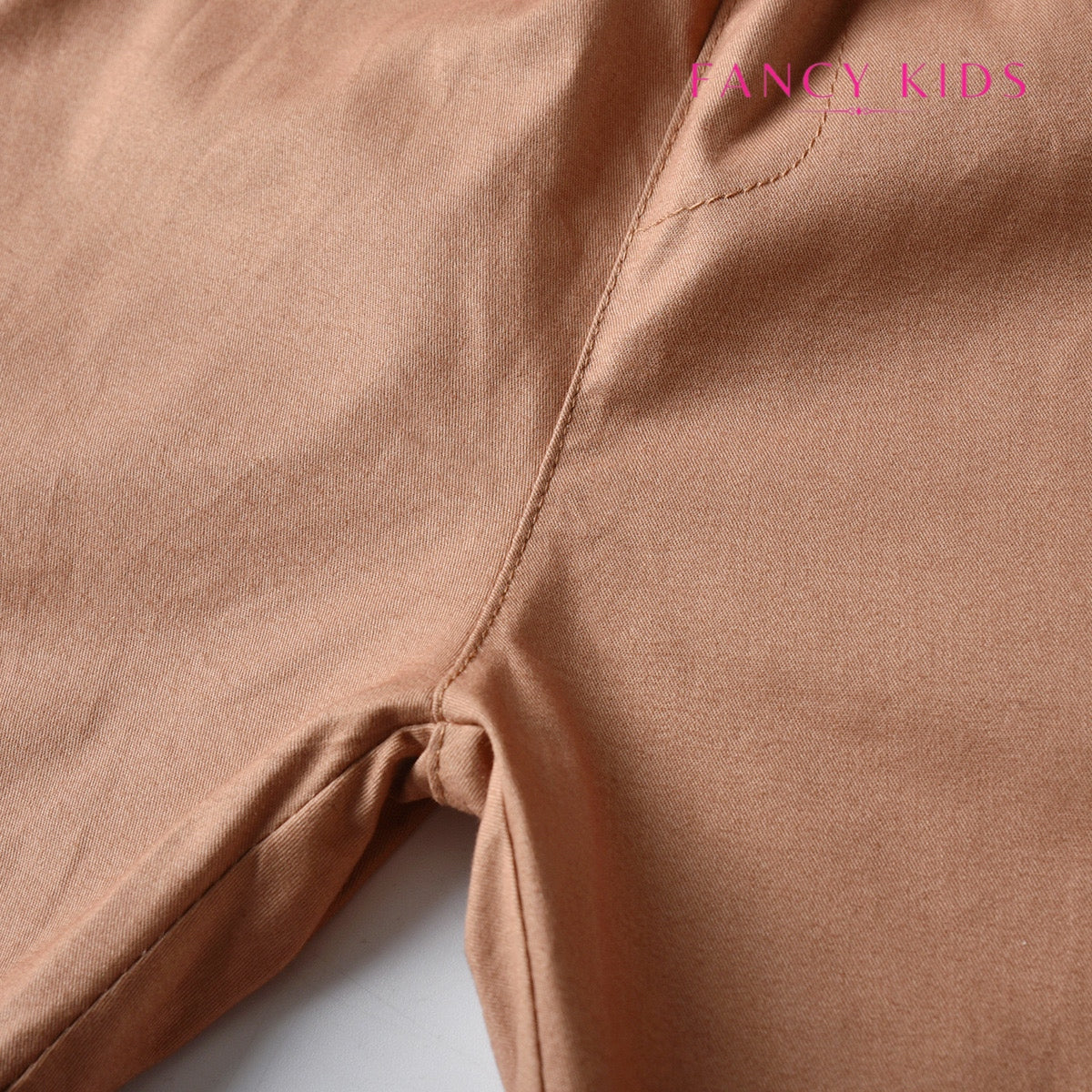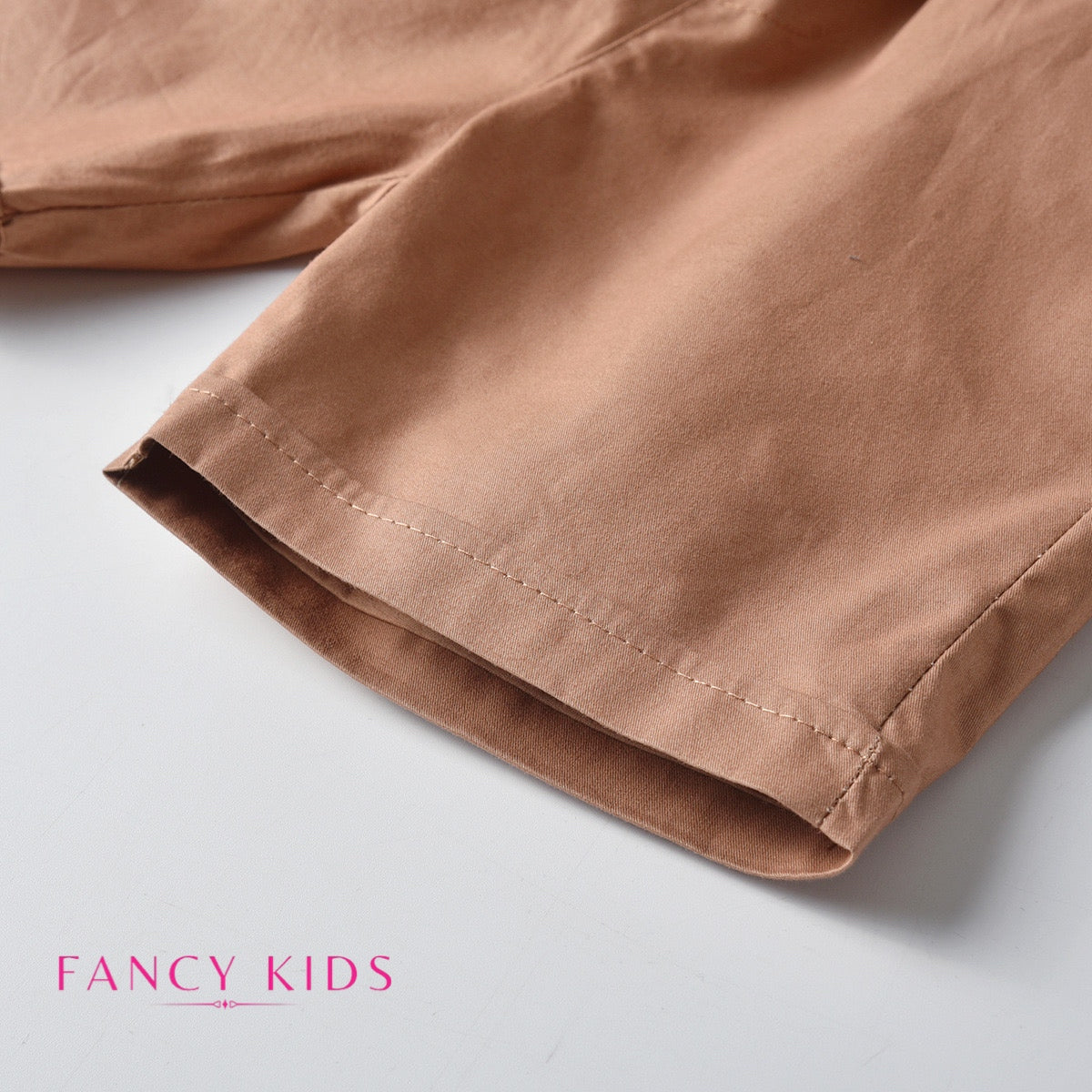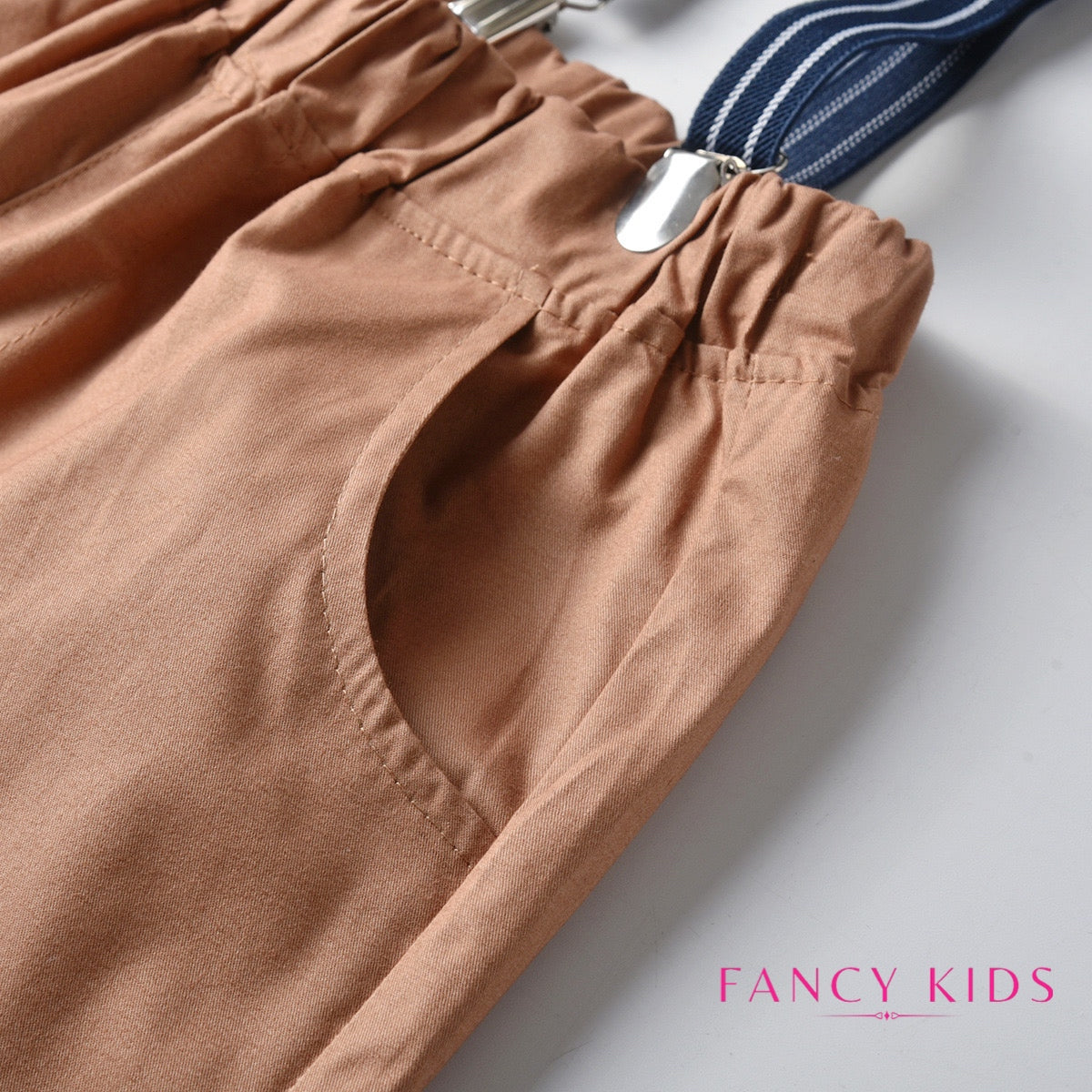 Cute boys outfit with dinosaur printed shirt , brown colour suspender short and a bow tie.