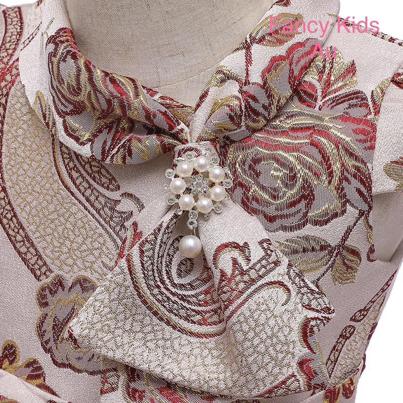 Neckline has a classic cut with a tie on the side embellished with a silver ornament.